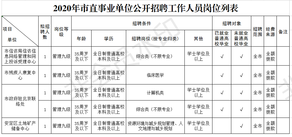 2021-01-25 15:51:03閱讀()定西市政府根據(jù)《甘肅省事業(yè)單位公開招聘人員暫行辦法》(甘辦發(fā)〔2011〕22號)、《關(guān)于進一步規(guī)范事業(yè)單位公開招聘工作的通知》(甘人社通〔2016〕48號)、《關(guān)于進一步做好艱苦邊遠(yuǎn)地區(qū)縣鄉(xiāng)事業(yè)單位公開招聘工作的通知》(甘人社通〔2017〕276號)、《關(guān)于應(yīng)對新冠肺炎疫情影響實施部分職業(yè)資格“先上崗、再考證”階段性措施的通知》(人社部發(fā)〔2020〕24號)和《定西市事業(yè)單位公開招聘人員實施意見(試行)》(定政辦發(fā)〔2011〕231號)、《定西市事業(yè)單位公開招聘人員實施意見的補充意見》(定政辦發(fā)〔2014〕97號)、《關(guān)于取消定西市事業(yè)單位公開招聘人員加分項政策的通知》(定政辦發(fā)〔2016〕130號)精神,2020年我市繼續(xù)采取公開招聘的辦法,擇優(yōu)聘用一定數(shù)量的高校畢業(yè)生到渭源縣、岷縣、漳縣和市直事業(yè)單位工作?,F(xiàn)將有關(guān)事項公告如下: