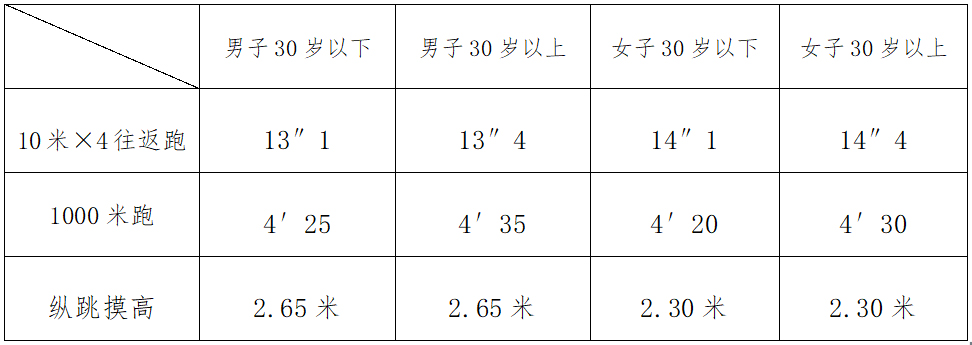 2.測(cè)評(píng)中,縱跳摸高不超過(guò)3次;10米×4往返跑不超過(guò)2次,考生有1次測(cè)評(píng)達(dá)標(biāo)的,即視為該項(xiàng)目測(cè)評(píng)合格,考生在測(cè)評(píng)前可試跑一次;1000米(800米)跑只測(cè)評(píng)1次。