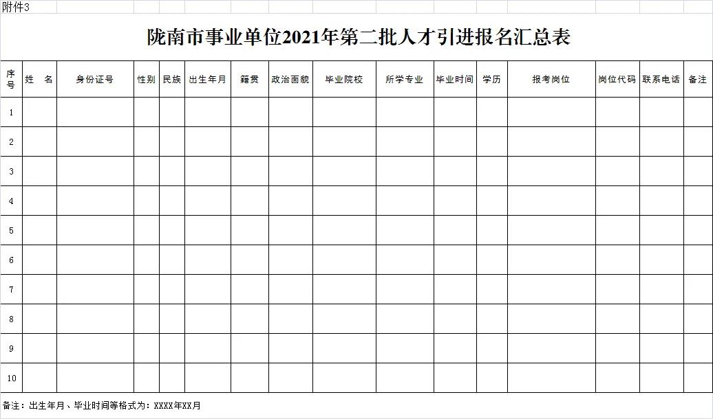 3.報名材料。現(xiàn)場報名人員須持畢業(yè)證(含電子注冊備案表)、學(xué)位證、報到證、身份證原件及復(fù)印件,《隴南市事業(yè)單位2021年第二批人才引進報名表》(附件2),《隴南市事業(yè)單位2021年第二批人才引進報名匯總表》(附件3),近期2寸正面免冠藍底彩色照片電子版(JPG格式)。除上述材料,留學(xué)人員要提供由教育部出具的境外學(xué)歷、學(xué)位認證書及駐外大使館留學(xué)回國人員證明。網(wǎng)上報名人員要建立一個以“報名人員姓名+崗位代碼”為名的文件夾,如王XX(A001)。文件夾中包含現(xiàn)場報名人員提交所有材料的彩色掃描件,其中附件2、附件3須提供電子版。