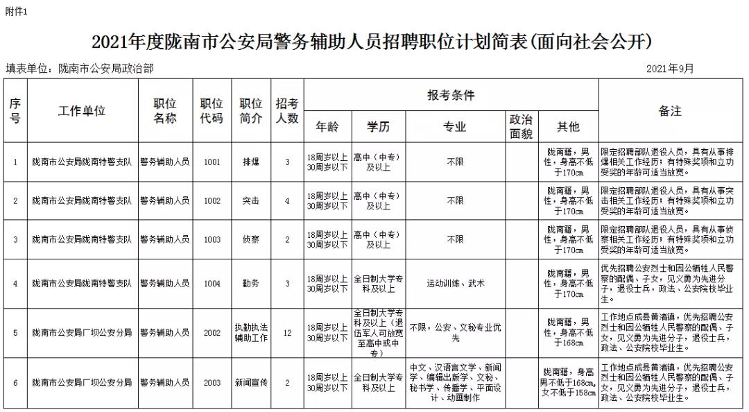 1、2021年度隴南市公安局警務(wù)輔助人員招聘職位計(jì)劃簡(jiǎn)表(面向社會(huì)公開)