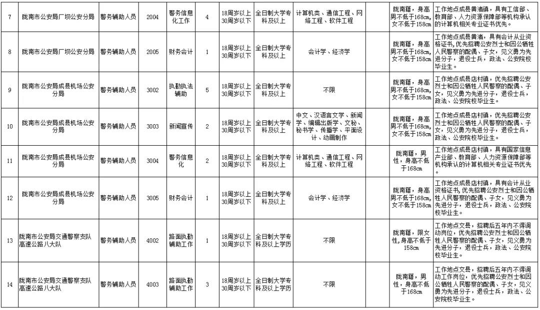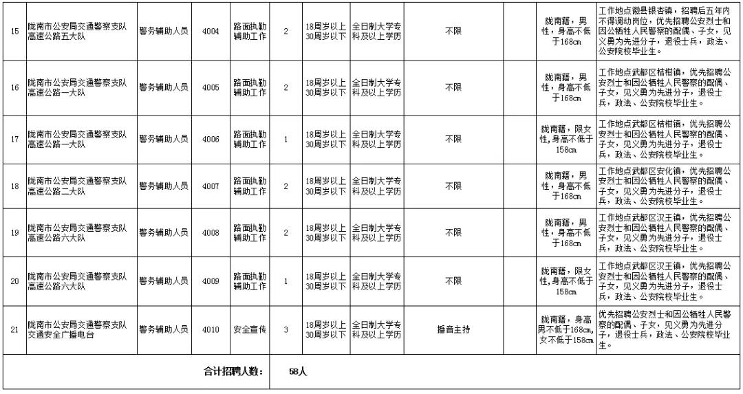 (一)隴南市公安局面向社會(huì)公開招聘警務(wù)輔助人員共58名,具體崗位如下: