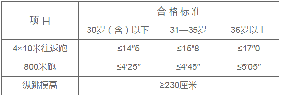 2.參照《公安機(jī)關(guān)錄用人民警察體能測評項目和標(biāo)準(zhǔn)(暫行)》,項目和合格標(biāo)準(zhǔn)設(shè)置如下: