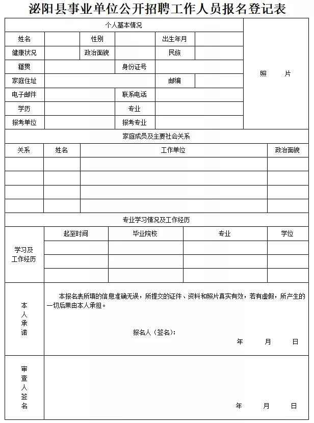 2、泌陽縣事業(yè)單位招聘工作人員報(bào)名登記表。