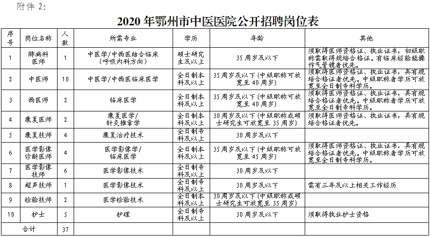 詳見附件2《2020年鄂州市中醫(yī)醫(yī)院公開招聘崗位表》。