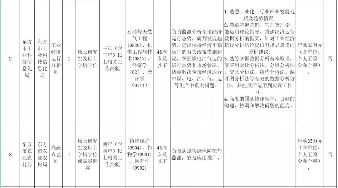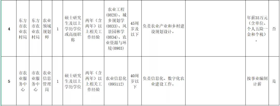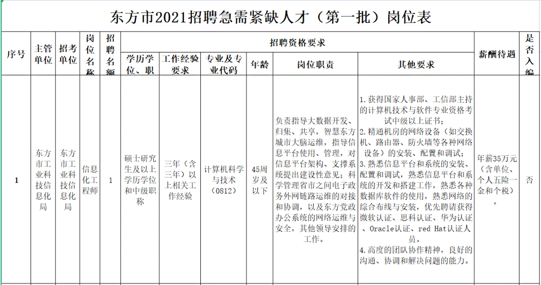 本次招聘急需緊缺人才共5名,其中納入編制管理1名。市工科信局信息化工程師1名、工業(yè)經(jīng)濟運行分析師1名;市農(nóng)業(yè)農(nóng)村局高級農(nóng)藝師1名、農(nóng)業(yè)領域規(guī)劃師1名;市農(nóng)業(yè)服務中心農(nóng)業(yè)信息管理崗1名(納入編制管理)。具體崗位要求詳見《東方市2021年招聘急需緊缺人才(第一批)崗位表》(附件1)。