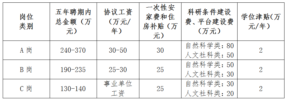 按照學校有關(guān)文件精神,與學校簽訂人才引進協(xié)議,兌現(xiàn)人才待遇。其中,博士可申報A、B、C三類崗位,相關(guān)待遇如下: