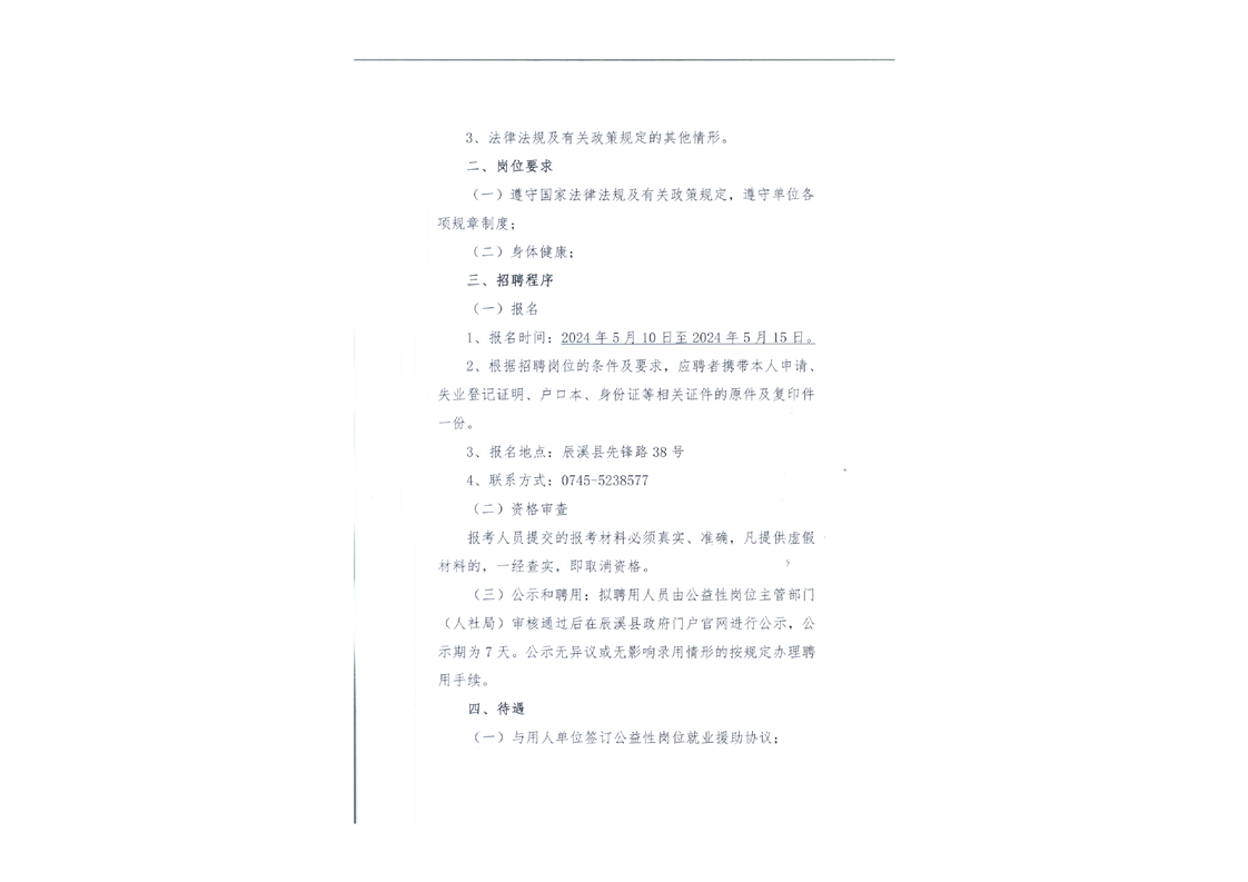 2024-05-12 21:12:49閱讀()辰溪縣人民政府因工作需要,現(xiàn)面向社會(huì)公開招聘公益性崗位工作人員1名。