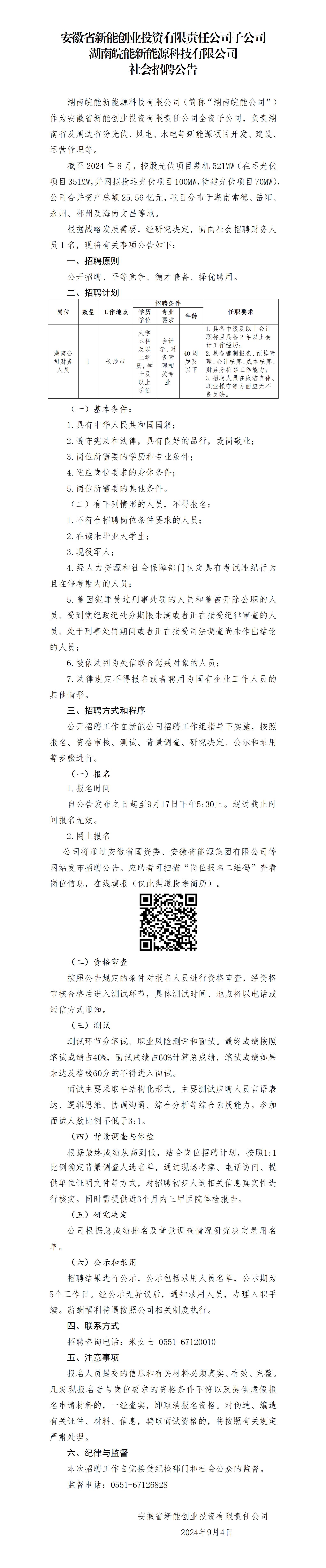 2024年安徽省新能創(chuàng)業(yè)投資有限責任公司子公司湖南皖能新能源科技有限公司社會招聘公告