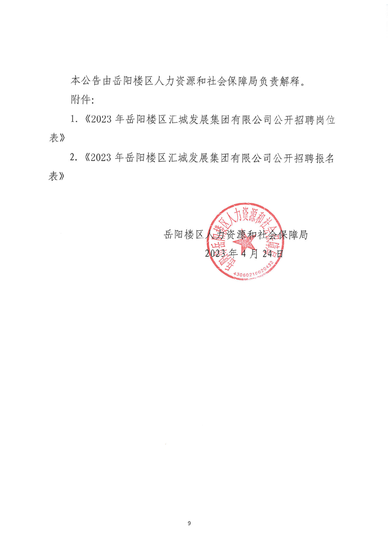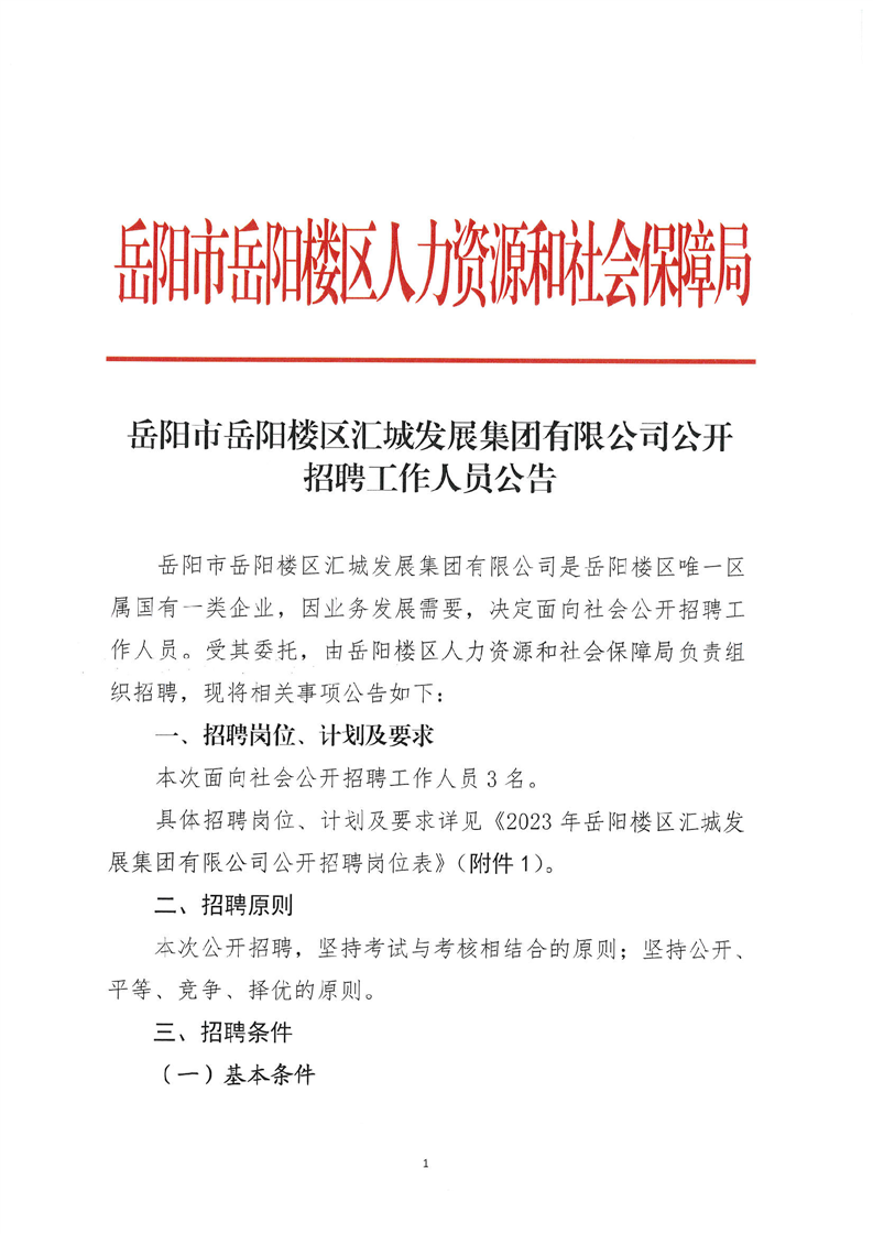 具體招聘崗位、計(jì)劃及要求詳見《2023年岳陽樓區(qū)匯城發(fā)展集團(tuán)有限公司公開招聘崗位表》(附件1)。