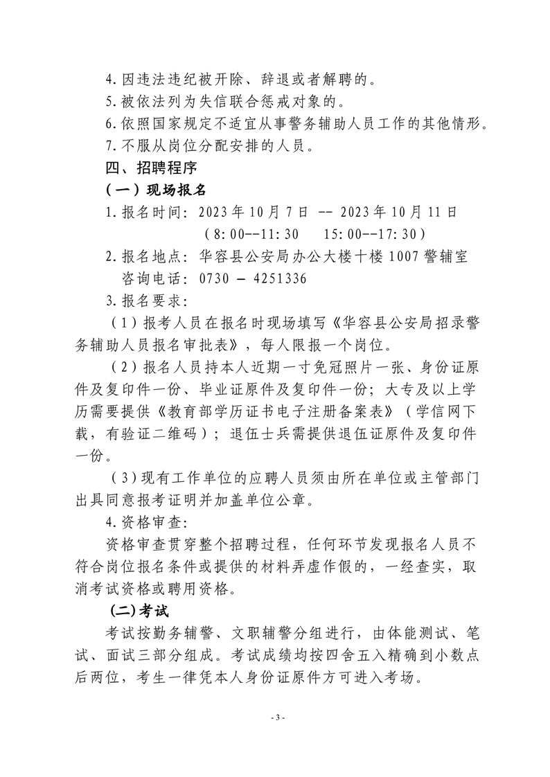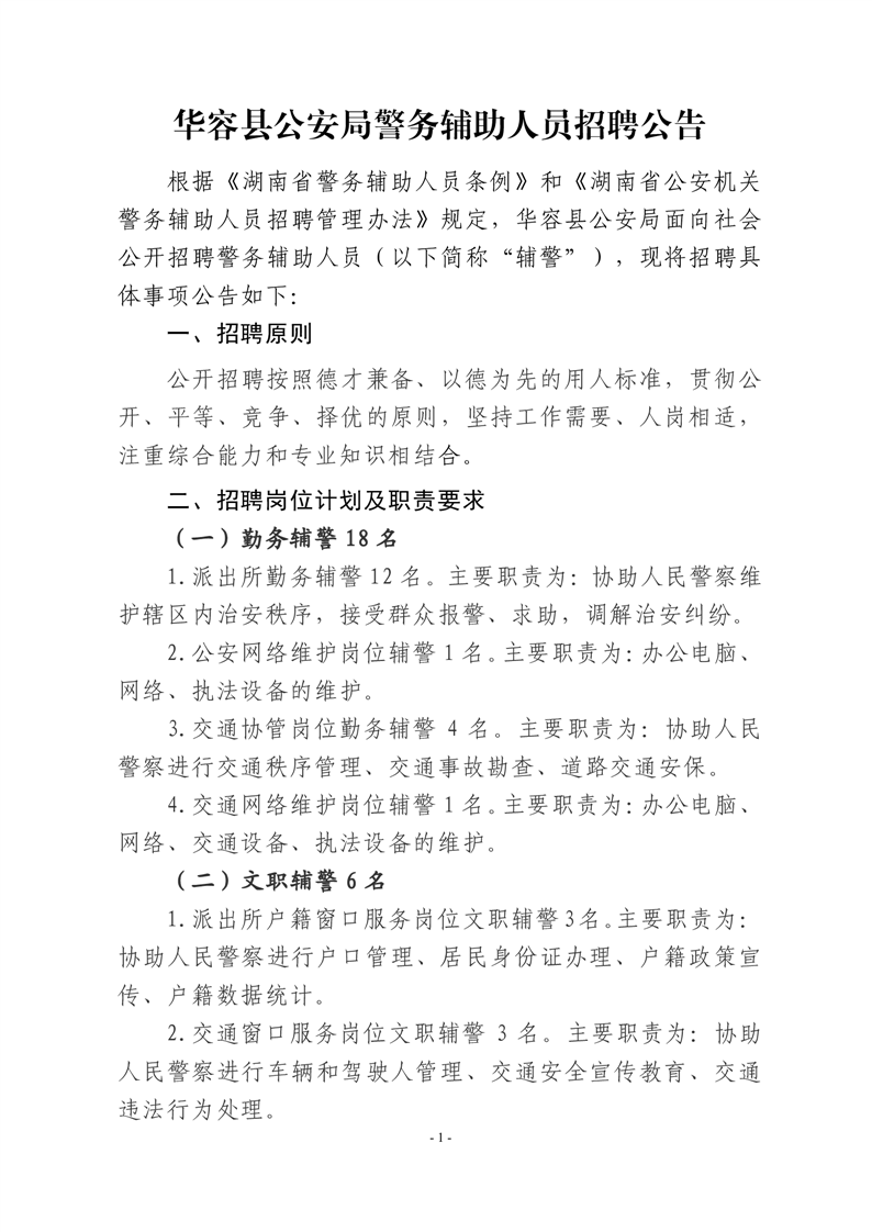 2023-09-20 17:57:55閱讀()華容縣人民政府根據(jù)《湖南省警務(wù)輔助人員條例》和《湖南省公安機(jī)關(guān)警務(wù)輔助人員招聘管理辦法》規(guī)定,華容縣公安局面向社會公開招聘警務(wù)輔助人員(以下簡稱“輔警”),現(xiàn)將招聘具體事項公告如下: