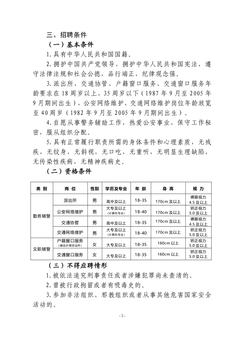 2.交通窗口服務(wù)崗位文職輔警3名。主要職責(zé)為:協(xié)助人民警察進(jìn)行車輛和駕駛?cè)斯芾?、交通安全宣傳教育、交通違法行為處理。