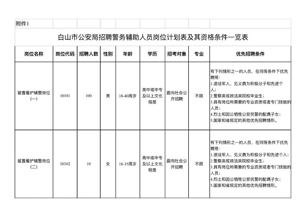 1.白山市公安局招聘警務(wù)輔助人員崗位計劃表及其資格條件一覽表
