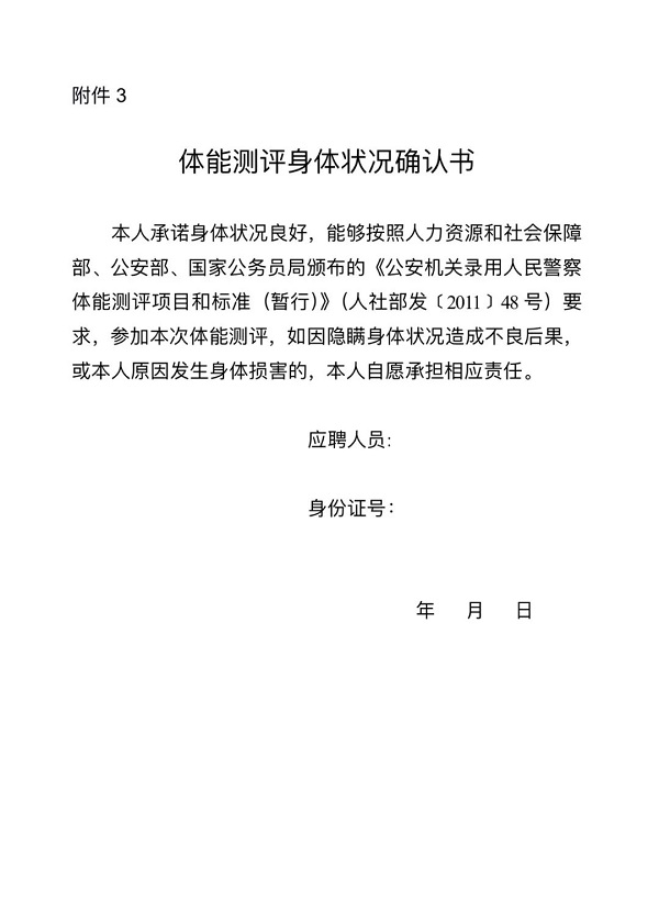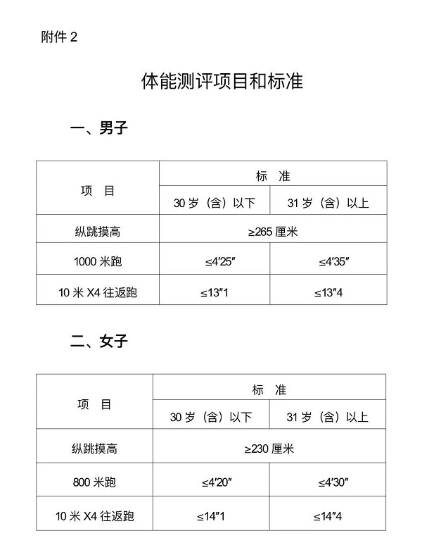 3.體能測評項目和標(biāo)準(zhǔn):按照《公安機關(guān)錄用人民警察體能測評項目和標(biāo)準(zhǔn)(暫行)》執(zhí)行,項目為:10米×4往返跑、縱跳摸高、男子1000米跑/女子800米跑,須三項測試均達標(biāo)為合格,詳見《體能測評項目和標(biāo)準(zhǔn)》(附件2)。不適宜劇烈運動或有隱形疾病的不得參加體能測試,否則后果自負;