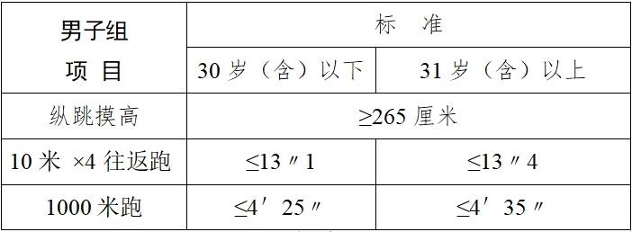 3.體能測評(píng)項(xiàng)目及標(biāo)準(zhǔn):本次招聘體能測評(píng)共三項(xiàng):縱跳摸高、10米×4往返跑、長跑(男子1000米跑)。體能測評(píng)參照《公安機(jī)關(guān)錄用人民警察體能測評(píng)項(xiàng)目和標(biāo)準(zhǔn)(暫行)》執(zhí)行,采取達(dá)標(biāo)制。