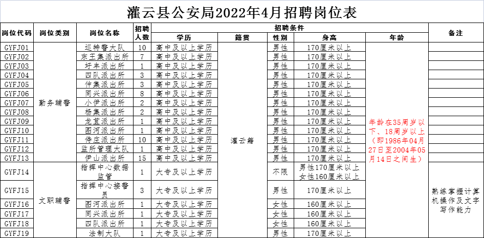 本次所招聘的警務輔助人員,是指為公安機關日常運轉和警務活動提供輔助支持的非人民警察身份且非事業(yè)編制身份人員。具體崗位及招聘條件等詳見《灌云縣公安局2022年4月招聘崗位表》,可在灌云縣人民政府網(wǎng)(http://www.guanyun.gov.cn/gyxzf/gsgg/gsgg.html)公示公告欄查詢。