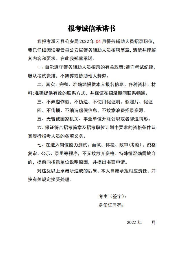 (9)連云港市公安機關在職輔警、工勤人員需攜帶單位同意報考證明。曾因違反公安機關警務輔助人員、工勤人員管理規(guī)定解除勞動合同的人員,不得報考。