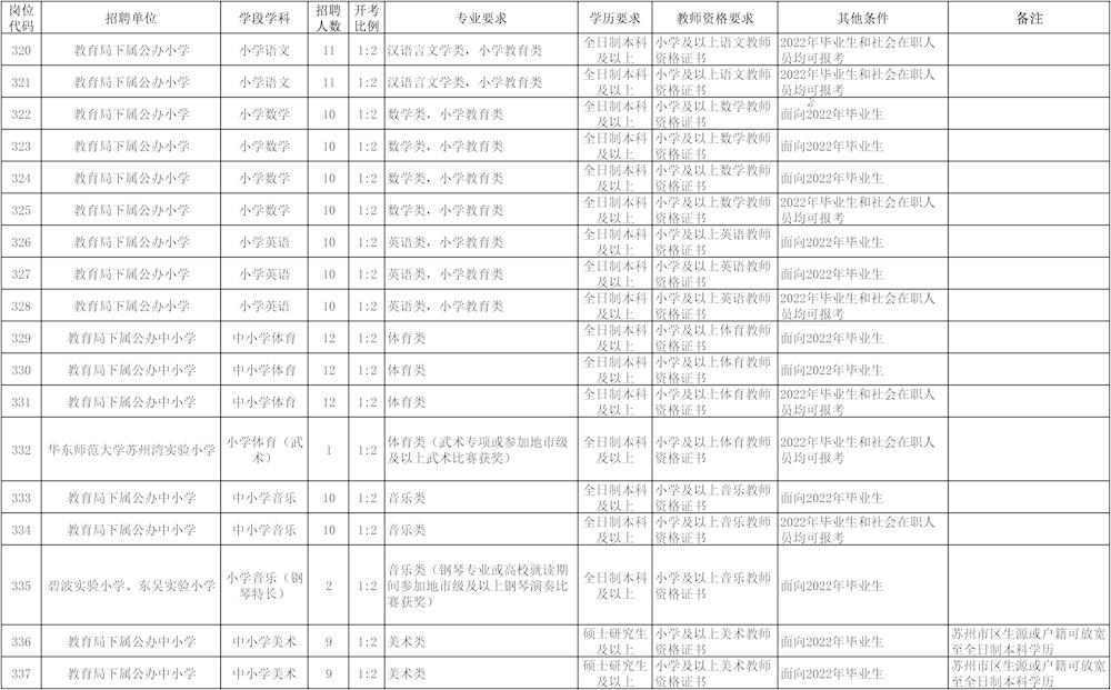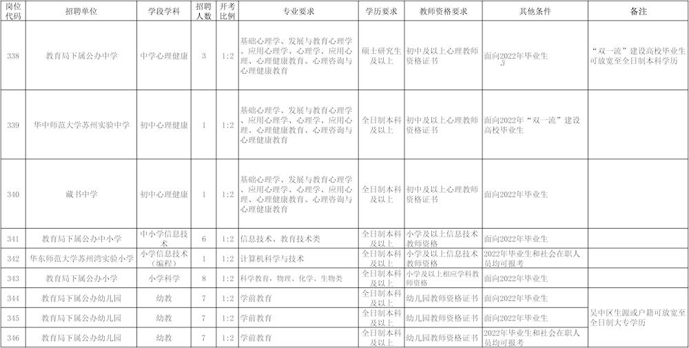 (七)具備《2022年蘇州市吳中區(qū)教育局公開招聘教師崗位簡介表》(見附件)中要求的資格條件,崗位簡介表中對招聘崗位基本條件和其他資格條件另有規(guī)定的從其規(guī)定,工作經(jīng)歷計算的截止時間為2022年8月31日。