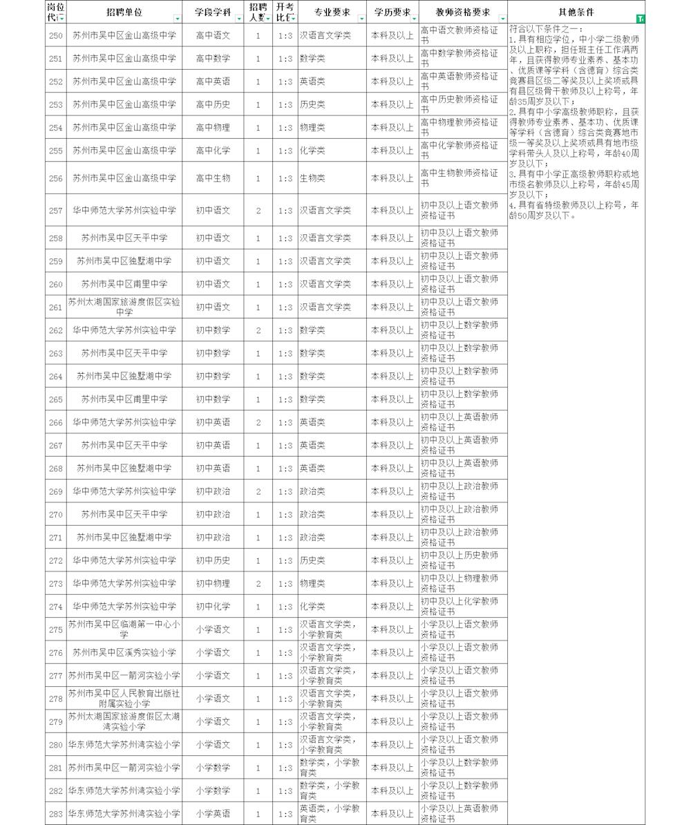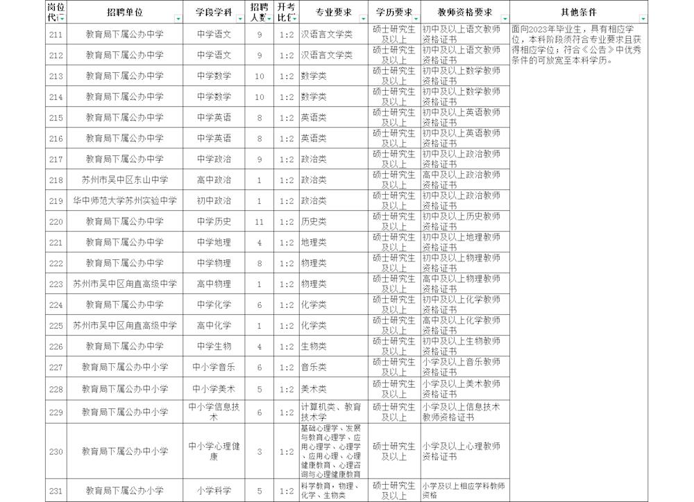 (四)具備《2023年蘇州市吳中區(qū)教育局公開招聘中小學(xué)教師崗位簡(jiǎn)介表》(見附件)中要求的資格條件,崗位簡(jiǎn)介表中對(duì)招聘崗位基本條件和其他資格條件另有規(guī)定的從其規(guī)定,工作經(jīng)歷計(jì)算的截止時(shí)間為2023年8月31日。