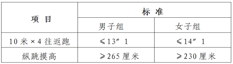 測評方法為:準備測試階段,受測者雙腳自然分開,呈站立姿勢。接到指令后,受測者屈腿半蹲,雙臂盡力后擺,然后向前上方快速擺臂,雙腿同時發(fā)力,盡力垂直向上起跳,同時單手舉起觸摸固定的高度線或高度標識,觸摸到高度線或者高度標識的視為合格。測試不超過三次。