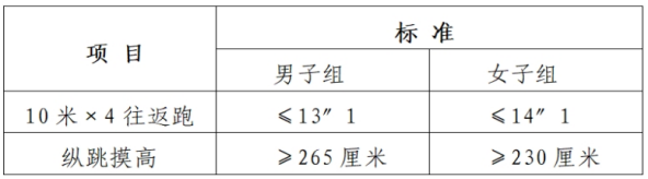 測評方法為:準(zhǔn)備測試階段,受測者雙腳自然分開,呈站立姿勢。接到指令后,受測者屈腿半蹲,雙臂盡力后擺,然后向前上方快速擺臂,雙腿同時(shí)發(fā)力,盡力垂直向上起跳,同時(shí)單手舉起觸摸固定的高度線或高度標(biāo)識,觸摸到高度線或者高度標(biāo)識的視為合格。測試不超過三次。
