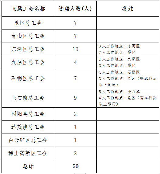 全市共選聘50名社會(huì)化工會(huì)工作者,詳情關(guān)注下表: