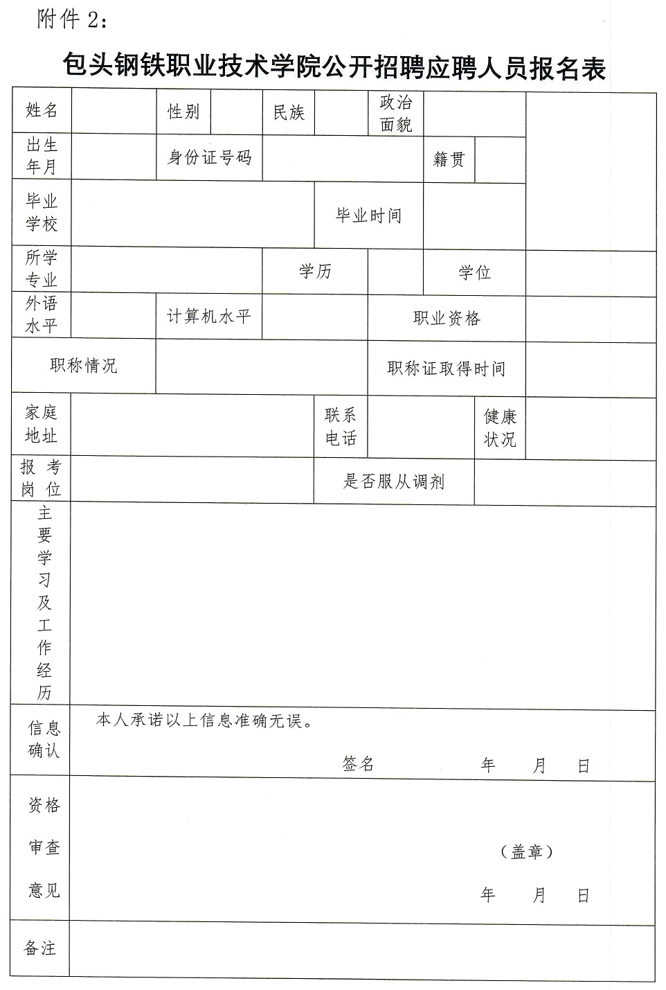 2. 包頭鋼鐵職業(yè)技術(shù)學(xué)院2022年對(duì)外公開招聘高校畢業(yè)生報(bào)名登記表