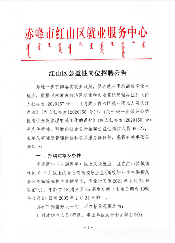 2023-02-28 14:38:43閱讀()赤峰公共招聘網(wǎng)為進一步貫徹落實就業(yè)政策,促進就業(yè)困難高校畢業(yè)生就業(yè),根據(jù)《內(nèi)蒙古自治區(qū)就業(yè)和失業(yè)登記管理辦法》(內(nèi)人社辦發(fā)[2020]57號)、《內(nèi)蒙古自治區(qū)就業(yè)困難人員認(rèn)定辦法》(內(nèi)人社辦發(fā)[2020]58號)和《關(guān)于進一步做好公益性崗位開發(fā)管理有關(guān)工作的通知》(內(nèi)人社辦發(fā)[2020]50號)等文件精神,現(xiàn)面向社會公開招聘公益性崗位人員60 名,主要從事輔助管理崗位和公共服務(wù)崗位等,現(xiàn)將有關(guān)事項公告如下: