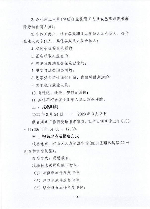 畢業(yè)兩年(含滿兩年)以上從未就業(yè)、且在紅山區(qū)城鎮(zhèn)常住6個月以上的全日制高校畢業(yè)生(高校畢業(yè)生主要指從全日制高等院校畢業(yè)的學(xué)生,畢業(yè)時間為2021年2月24日以前的),年齡在18周歲至35周歲之間(出生日期為1988年2月24日至2005年2月24日的)。