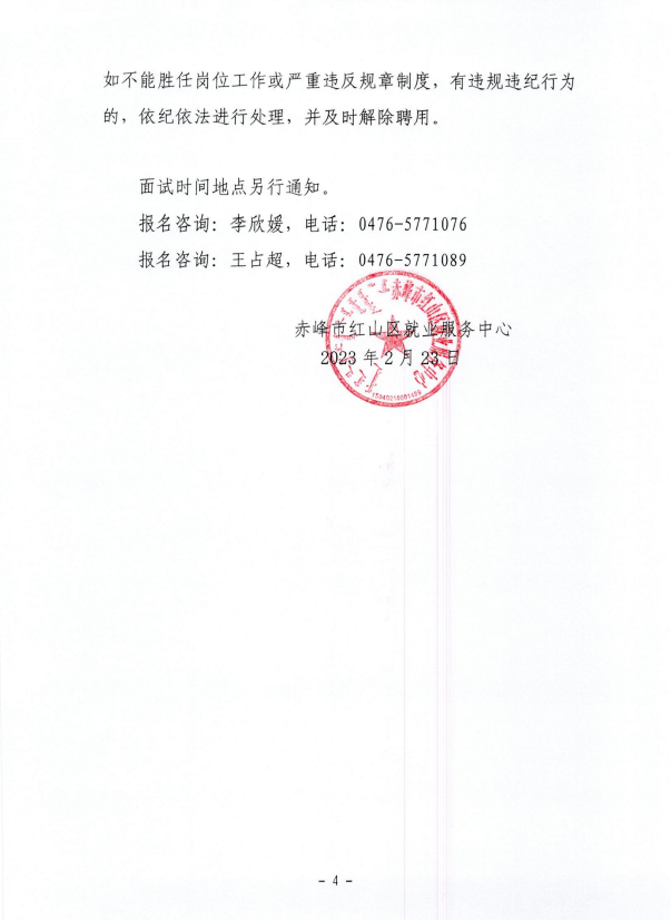 確定擬聘用人員名單,由赤峰市紅山區(qū)就業(yè)服務(wù)中心統(tǒng)一進行公示,接受社會監(jiān)督,公示期為5個工作日。公示期滿,對沒有問題或者反映問題不影響聘用的,辦理聘用手續(xù)。對反映有嚴(yán)重問題的并查有實據(jù)的,取消聘用資格。