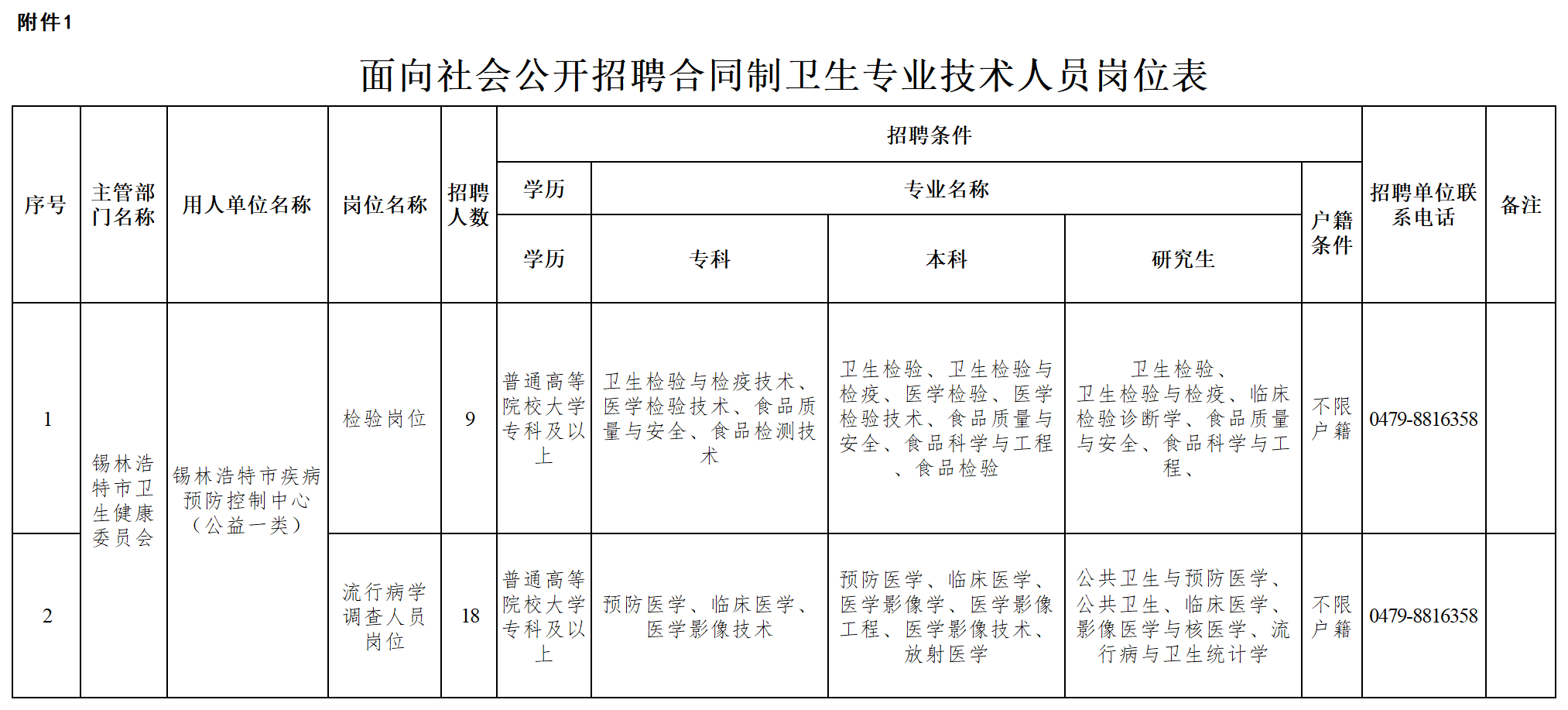 本次錫林浩特市疾病預防控制中心面向社會公開招聘合同制衛(wèi)生專業(yè)技術人員27人(其中:檢驗崗位9人、流行病學調查人員崗位18人)詳見附件1。