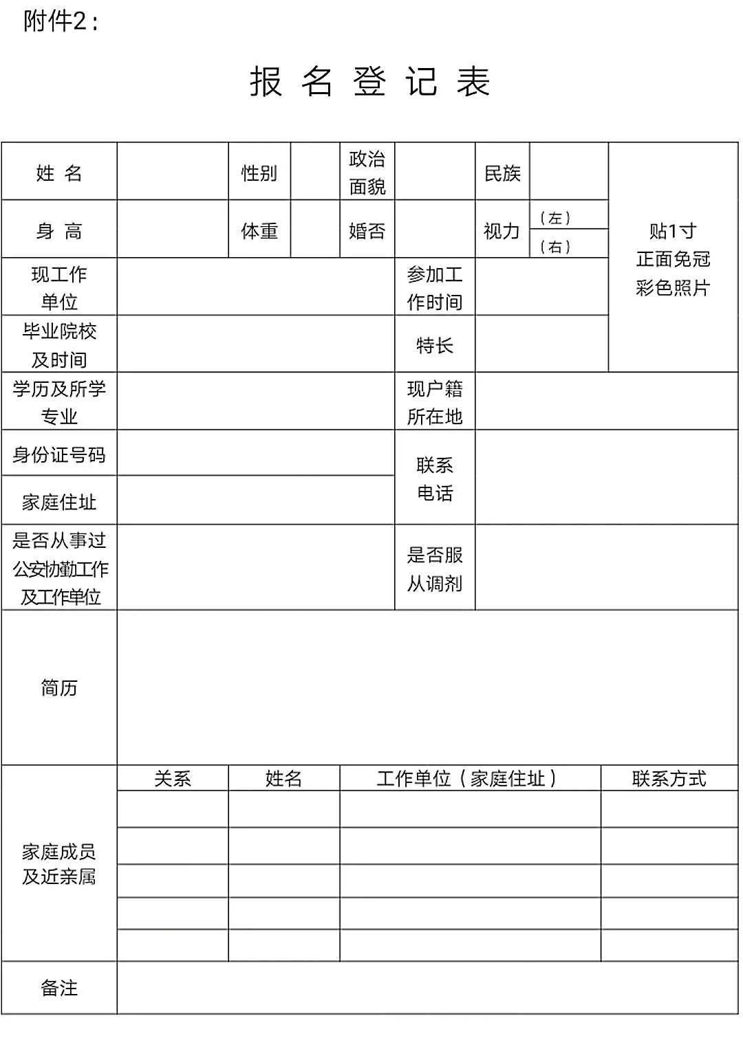 (三)報(bào)名要求:報(bào)名人員填寫《報(bào)名登記表》(附件2)、《應(yīng)聘誠信承諾書》(附件3),持本人有效期內(nèi)身份證、戶口本、國家承認(rèn)的學(xué)歷證書、個人信用報(bào)告、其他相關(guān)特長證明報(bào)名,退役軍人持退出現(xiàn)役證(以上材料均須原件和復(fù)印件,大專及以上學(xué)歷的請出具學(xué)信網(wǎng)《教育部學(xué)歷證書電子備案表》)。報(bào)名時,交近期1寸同底免冠彩色照片3張(照片背面寫上個人姓名)。