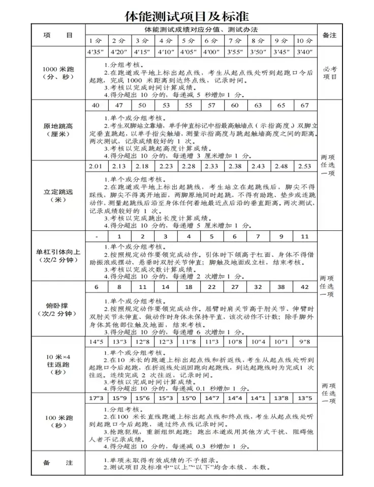 03體能、體型測試:標(biāo)準(zhǔn)參照《國家綜合性消防救援隊伍消防員招錄體能測試、崗位適應(yīng)性測試項目及標(biāo)準(zhǔn)》執(zhí)行。考核項目為:1000米跑必考項;原地跳高、立定跳遠(yuǎn),兩項選一項;單杠引體向上、俯臥撐,兩項選一項;10米×4往返跑、100米跑兩項選一項。主要考察招收對象肌肉力量、肌肉耐力和爆發(fā)力等。