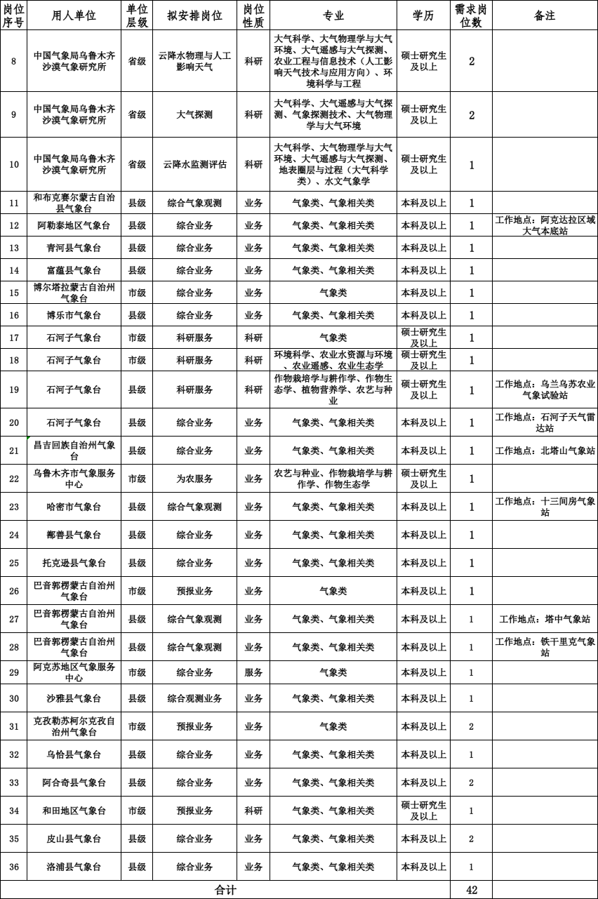 2024-03-12 17:09:00閱讀()新疆維吾爾自治區(qū)氣象局根據(jù)《氣象部門事業(yè)單位公開招聘人員管理辦法》,為加強(qiáng)新疆氣象人才隊(duì)伍建設(shè),滿足新疆氣象事業(yè)發(fā)展需要,現(xiàn)面向各高等院校、科研院所應(yīng)屆畢業(yè)生招聘事業(yè)編制工作人員,有關(guān)事項(xiàng)公告如下: