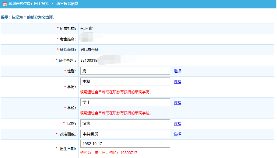 按照系統(tǒng)標(biāo)紅的提示信息如實(shí)、準(zhǔn)確、完整地填寫(xiě)個(gè)人信息。
