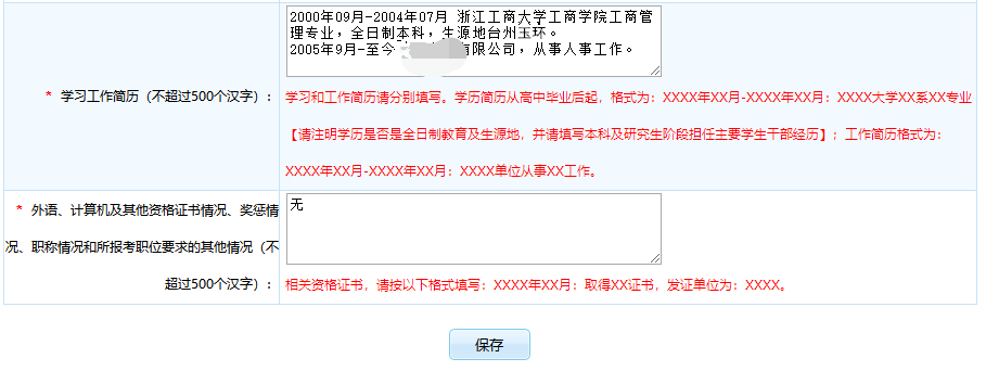 提醒:考生應(yīng)逐條填寫(xiě)完整的學(xué)習(xí)、工作簡(jiǎn)歷(請(qǐng)從高中開(kāi)始逐一填寫(xiě)至2022.4止,不要存有斷檔時(shí)限)。招聘崗位要求全日制學(xué)歷的,請(qǐng)?jiān)趯W(xué)習(xí)簡(jiǎn)歷填寫(xiě)時(shí)注明是否是全日制教育;部分崗位要求2022年普通高校應(yīng)屆畢業(yè)生的,請(qǐng)?jiān)趯W(xué)習(xí)簡(jiǎn)歷中注明畢業(yè)時(shí)間;部分崗位要求職業(yè)(資格)證書(shū)的,請(qǐng)務(wù)必在其他情況中按正確的格式如實(shí)填寫(xiě)完整詳細(xì)的信息。