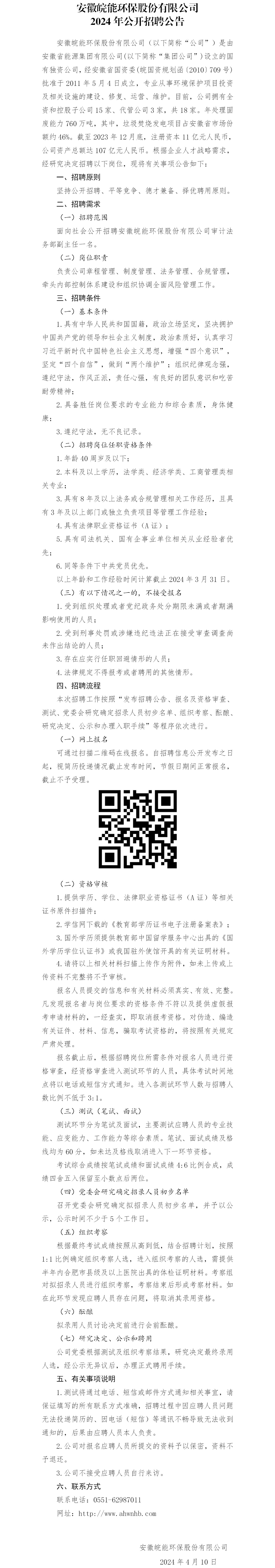 2024年安徽皖能環(huán)保股份有限公司公開招聘公告