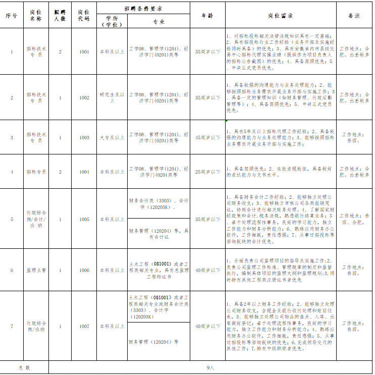 1.崗位需求:招聘人數(shù)共計(jì)9人,具體招聘崗位詳見附件1:《安徽皖岳信合項(xiàng)目管理有限公司2024年公開招聘崗位需求表》。
