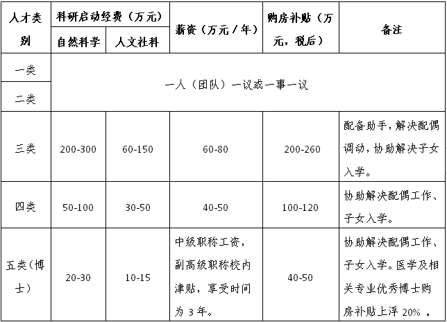 1、對(duì)于全職引進(jìn)的博士及以上高層次人才,按照《皖南醫(yī)學(xué)院引進(jìn)高層次人才實(shí)施辦法(修訂)》(校政[2018]191號(hào))(http://rsc.wnmc.edu.cn/63/10/c1981a90896/page.htm)提供購房補(bǔ)貼、安家費(fèi)、科研啟動(dòng)經(jīng)費(fèi)等。標(biāo)準(zhǔn)如下: