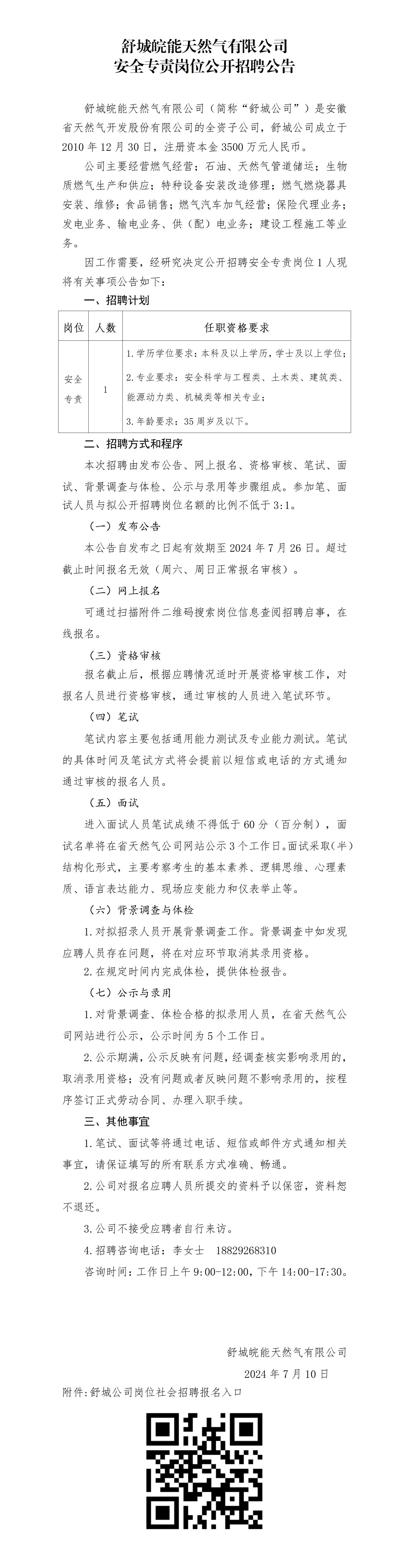 2024年六安舒城皖能天然氣有限公司安全專責(zé)崗位公開(kāi)招聘公告