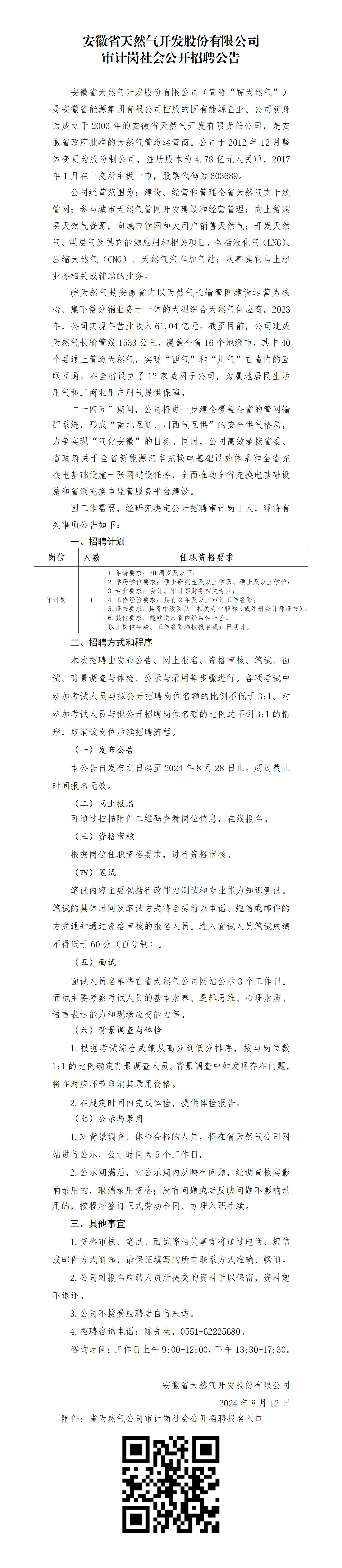 2024年安徽省天然氣開發(fā)股份有限公司審計崗社會公開招聘公告