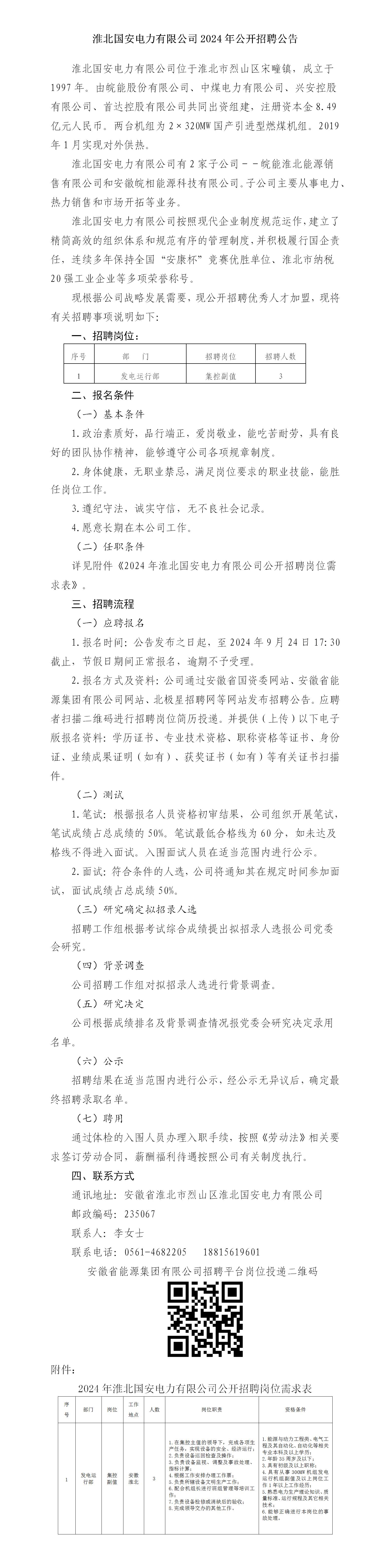 2024年淮北國安電力有限公司公開招聘公告