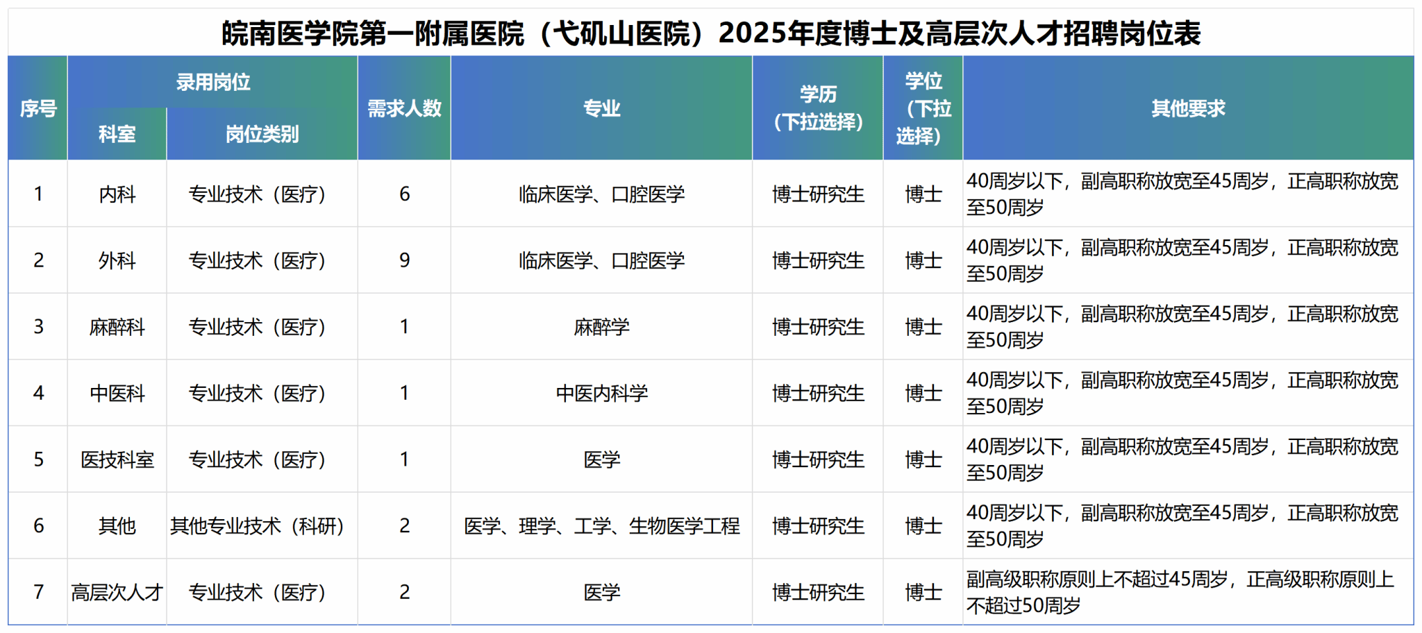 (五)年齡條件:原則上博士畢業(yè)生40周歲以下,具有副高級(jí)職稱的人員年齡可放寬至45周歲,具有正高級(jí)職稱的人員年齡可放寬至50周歲。詳情見招聘崗位表中的年齡要求,其他高層次人才年齡按皖南醫(yī)學(xué)院弋磯山醫(yī)院高層次人才引進(jìn)暫行辦法要求執(zhí)行。