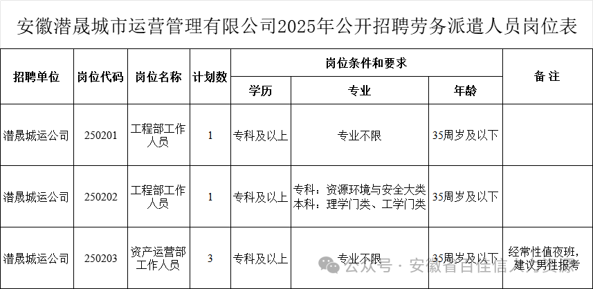 根據(jù)工作需要,安徽潛晟城市運(yùn)營管理有限公司委托安徽省百佳信人力資源服務(wù)有限責(zé)任公司面向社會(huì)公開招聘勞務(wù)派遣人員5名,聘用人員將通過勞務(wù)派遣方式在安徽潛晟城市運(yùn)營管理有限公司工作,現(xiàn)就招聘工作有關(guān)事項(xiàng)公告如下: