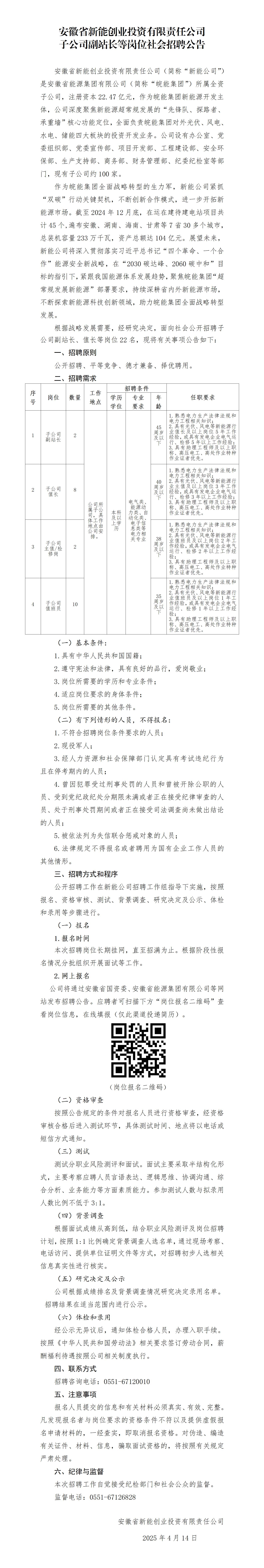 2025年安徽省新能創(chuàng)業(yè)投資有限責(zé)任公司子公司副站長(zhǎng)等崗位社會(huì)招聘公告