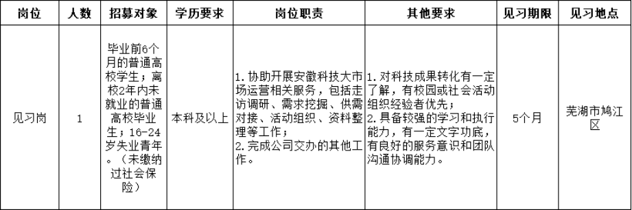 因工作需要,經安徽科技大市場建設運營有限責任公司研究決定,委托安徽皖信人力資源管理有限公司公開招募1名見習人員。現就有關事項公告如下: