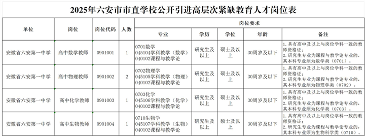 2025年安徽省六安第一中學(xué)引進高層次緊缺教育人才共計5名。具體招聘崗位、條件如下: