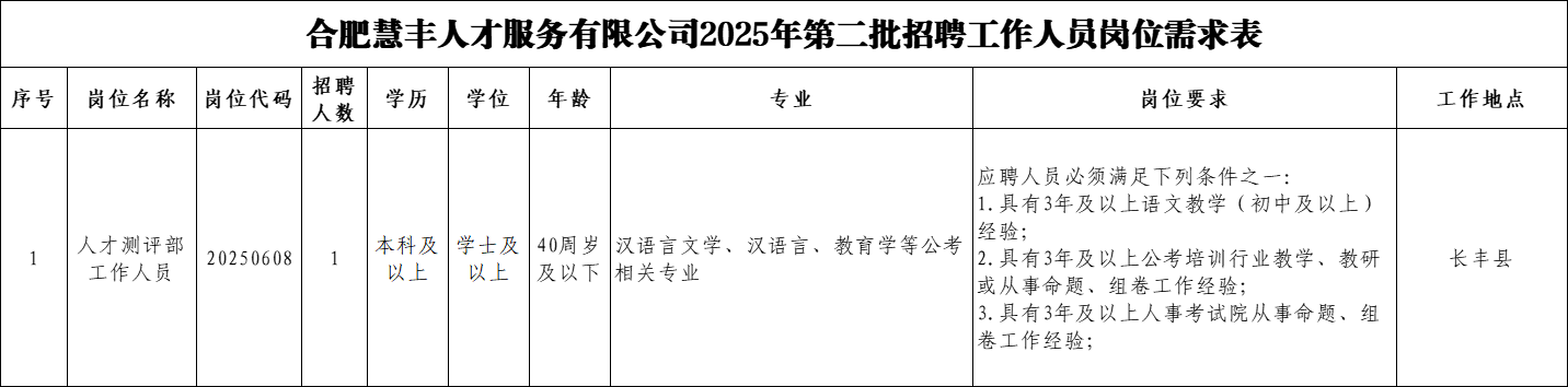 附件1:合肥慧豐人才服務(wù)有限公司2025年第二批招聘工作人員崗位需求表