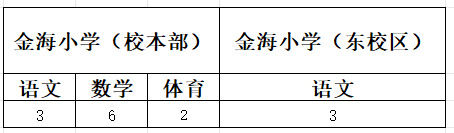 金海小學(xué)校本部:小學(xué)語文3人、數(shù)學(xué)6人,體育2人。