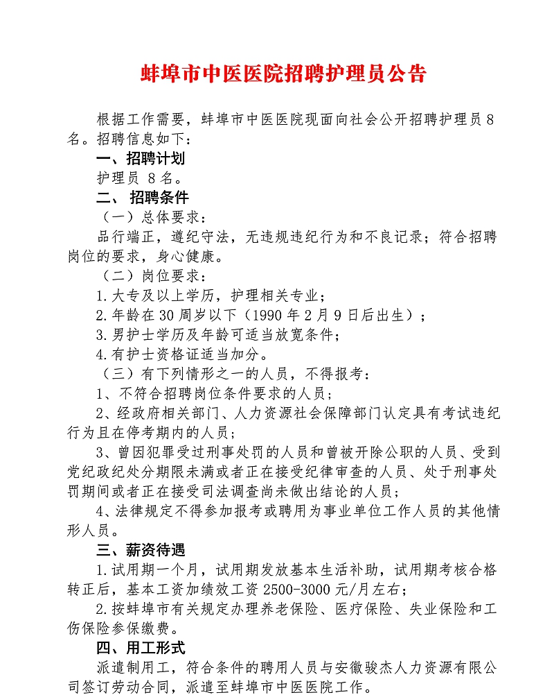 2020年蚌埠市中醫(yī)醫(yī)院招聘護理員公告
