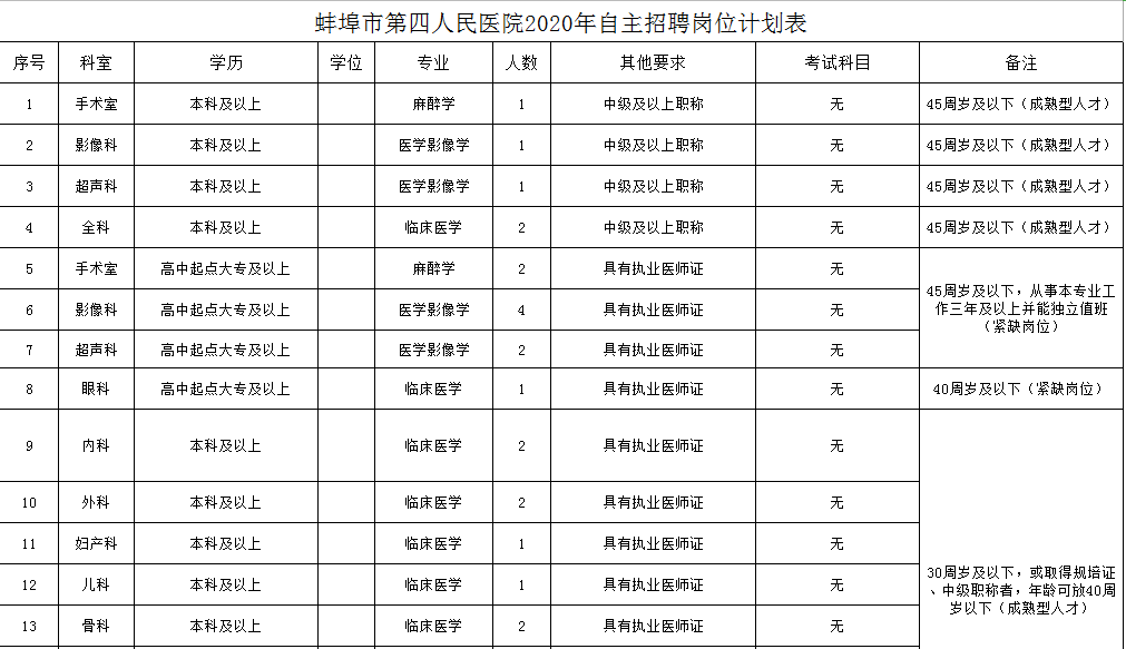 (三)應(yīng)聘者戶籍所在地不限,年齡要求:公開招聘中年齡要求的“30周歲及以下”為“1990年12月28日(含)后出生”(其他涉及年齡計(jì)算的依此類推)。部分崗位另有要求的,詳見《蚌埠市第四人民醫(yī)院2020年公開招聘工作人員崗位計(jì)劃表》;